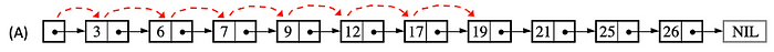但是我们在每个节点增加向后的指向指针,比如列表中每三个其他节点都有一个指向后面三个节点的指针,如图(4)所示,那么只需要3步就可以到达19