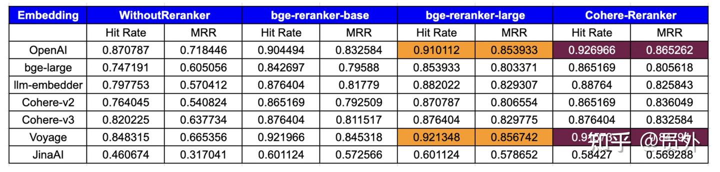 - 几乎所有的Embeddings都在重排之后显示出更高的命中率和MRR,所以rerank的效果是非常显著的;